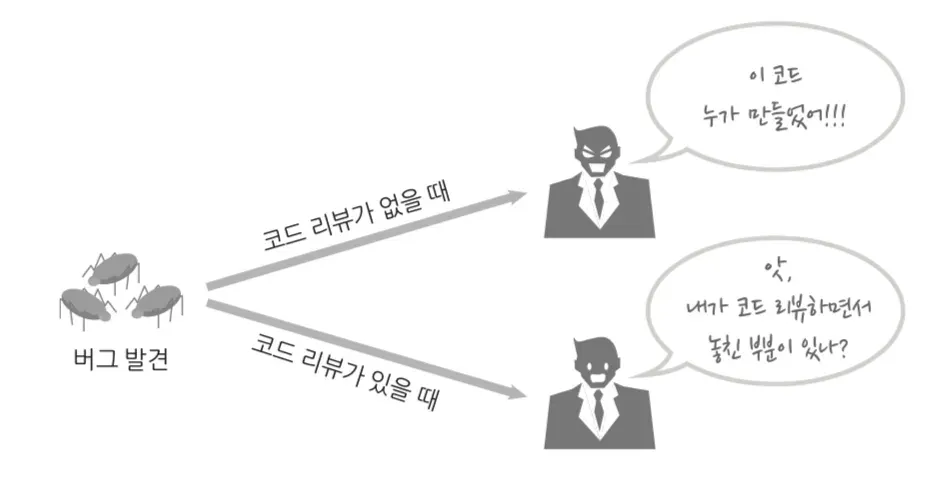 코드리뷰의 핵심은 단순히 코딩 스타일을 일관되 게 유지하거나, 예상되는 문제를 일찍 파악하는 데에 그치지 않고 코드에 대한 책임이 그 코드를 만든 사람 혼자에게 있지 않고 우리 모두에게 있다는 문화를 만드는 데에 있습니다.