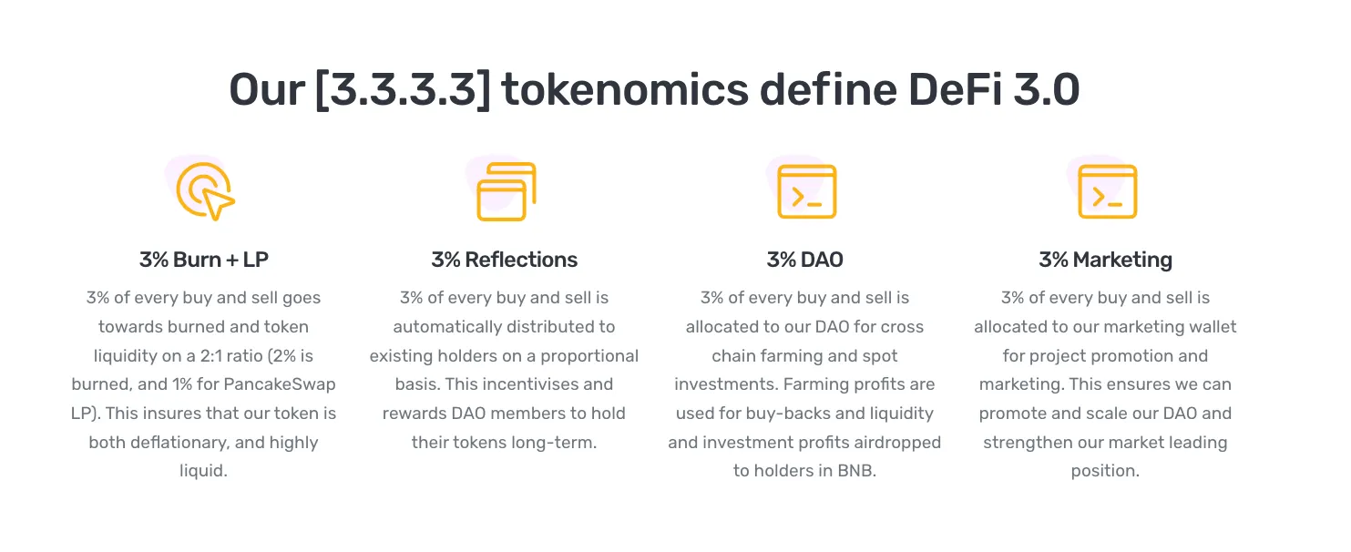 Airdrops (+, +):Β The first innovation, is via the [3.3.3.3] tax, with 3% reflections on buys and sells claimable as BNB for DEFI stakers. Further incentivizes staking and punishes sellers.