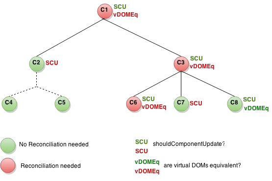 React 에서는 Reconciliation 작업을 선행하기 때문에 UI 에 대한 제어를 최소화시키는 것이다 (일반적으로 UI 제어 비용이 상대적으로 더 비싸다.) React 의 diffing 알고리즘은 휴리스틱 알고리즘으로 다음과 같은 조건을 통해서 O(n)에 근사할 수 있도록 구현하였다.