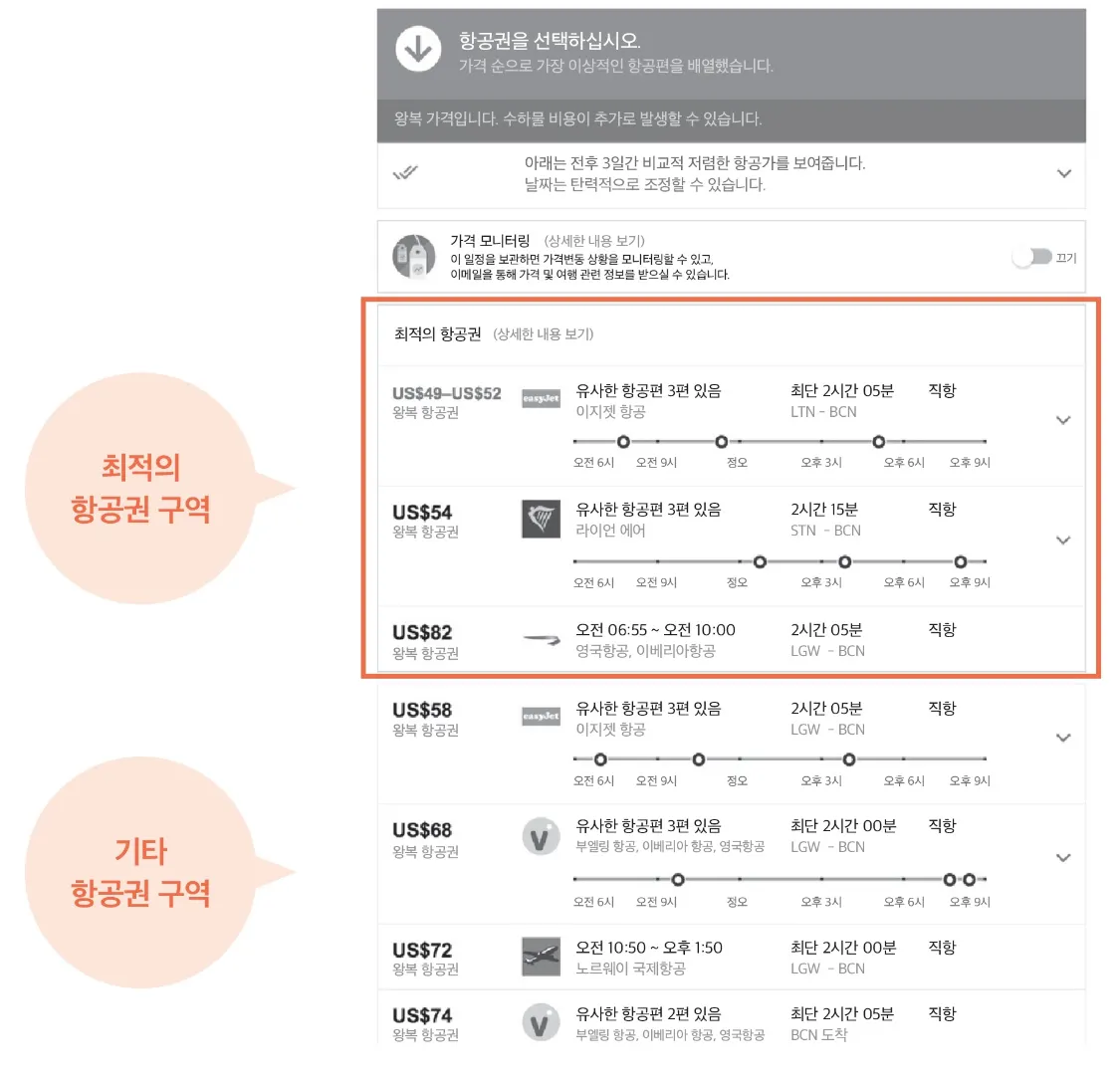 위의 이미지를 보면 최적의 항공권으로 3개의 선택지를 제공하고, 나머지 항공편도 정보로서 제공함.