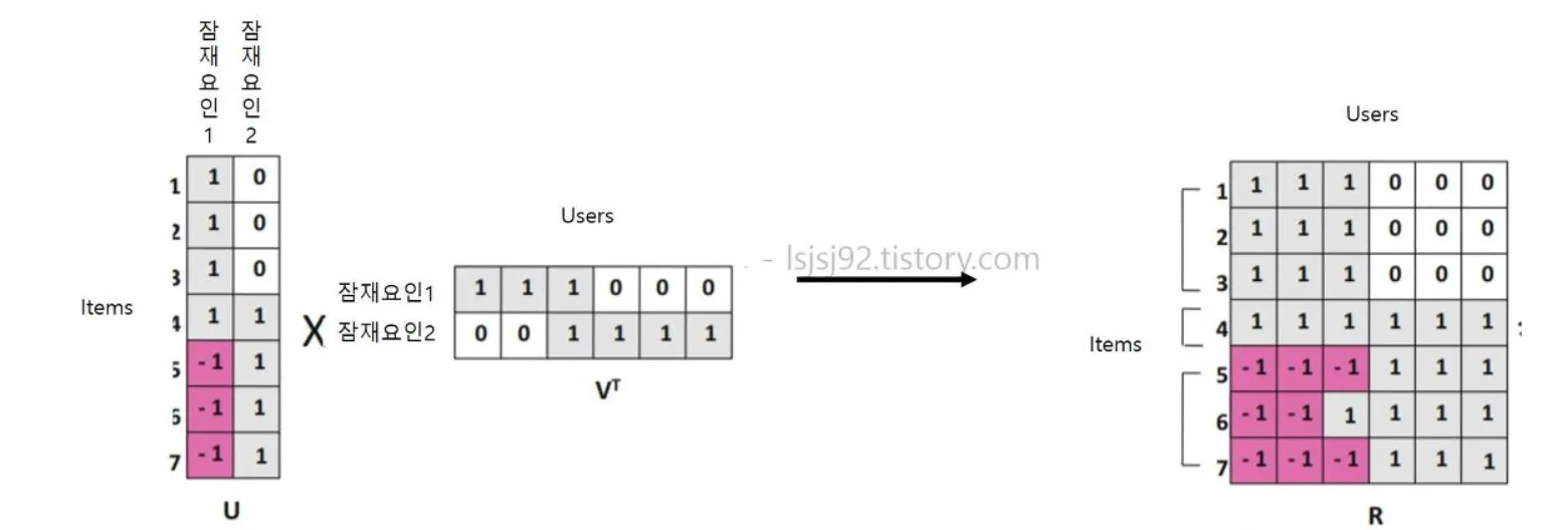 사용자 - 아이템 데이터 행렬을 사용해 잠재 요인을 찾아낸다.