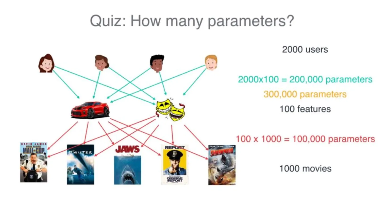 그러나 maxrix factorization 을 사용하면 위와 같이 파라메터가 줄어드는 것을 볼 수 있다.