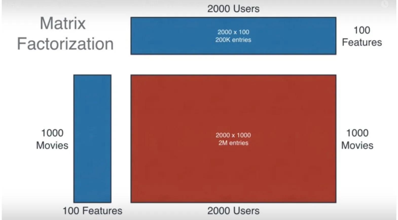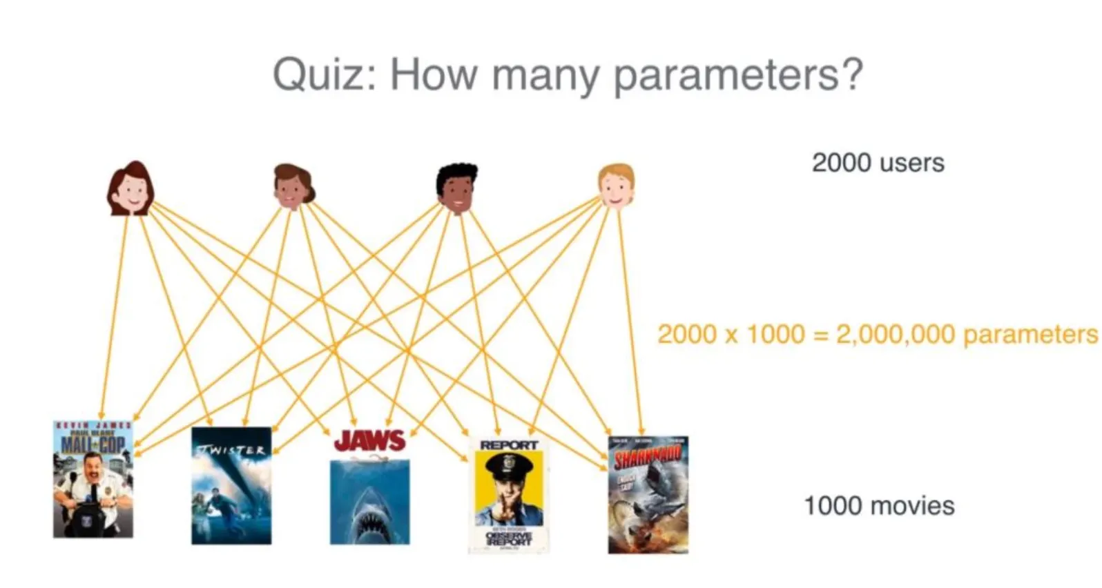 행렬 분해 방법을 사용하지 않으면 사용자(2000) - 아이템(1000) 의 데이터 셋이 있다면 아래와 같이 1000 * 2000 의 파라메터가 필요하다