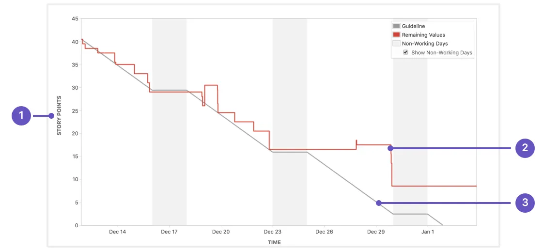 Sprint 기간동안 작업 시간(or storypoint) 과 남은 시간을 계산해서 chart 로 표현한다. 지정된 시간 안에 작업을 완료할 수 있는 팀의 능력을 예측하고 변화를 추적하는데 유용하다.