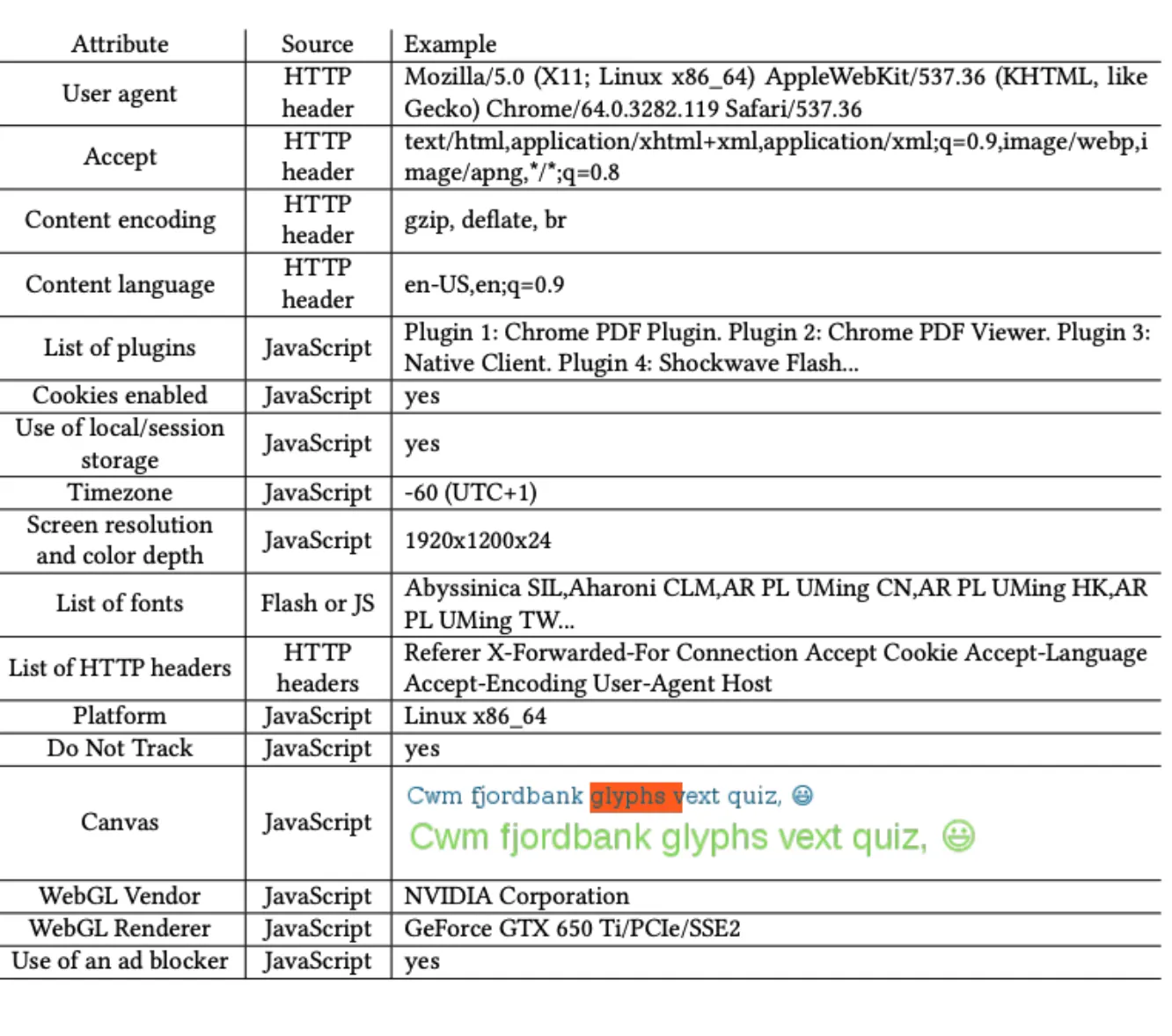 다양한 browser 를 특정하는 다양한 attribute 들이 있지만 기술적으로 리서치가 필요한 canvas fingerprint, audio fingerprint 만 살펴보려고 한다.