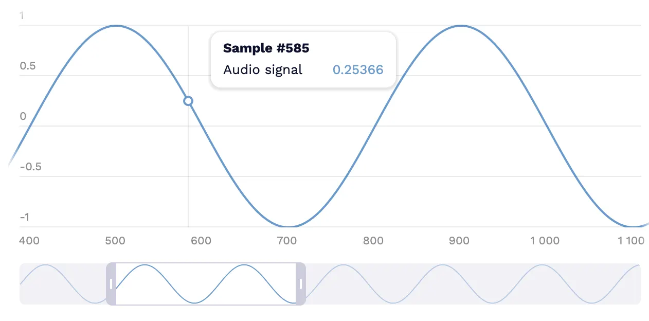 메모리에 저장된 audio snippet. 각 데이터는 샘플마다 1~-1 사이의 32bit 소수점 표시로 저장된다. multiple channel 을 보유할 수 있지만 목적 상 1개의 채널만 사용한다.