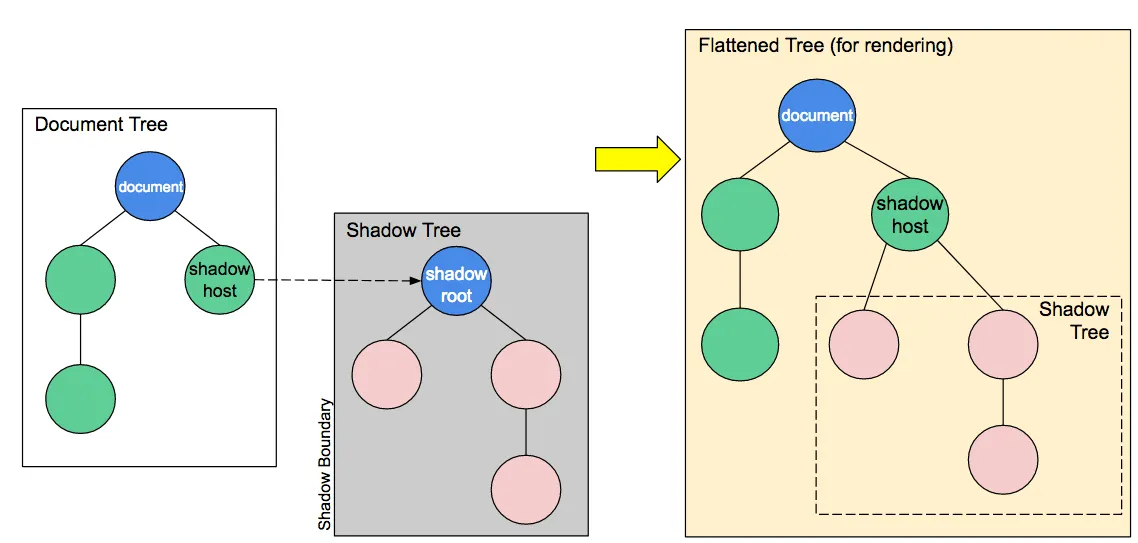 캡슐화된 "그림자" DOM 트리를 엘리먼트 — 메인 다큐먼트 DOM 으로부터 독립적으로 렌더링 되는 — 를 추가하고 연관된 기능을 제어하기 위한 JavaScript API 의 집합. 이 방법으로 엘리먼트의 기능을 프라이빗하게 유지할 수 있어, 다큐먼트의 다른 부분과의 충돌에 대한 걱정 없이 스크립트와 스타일을 작성할 수 있음